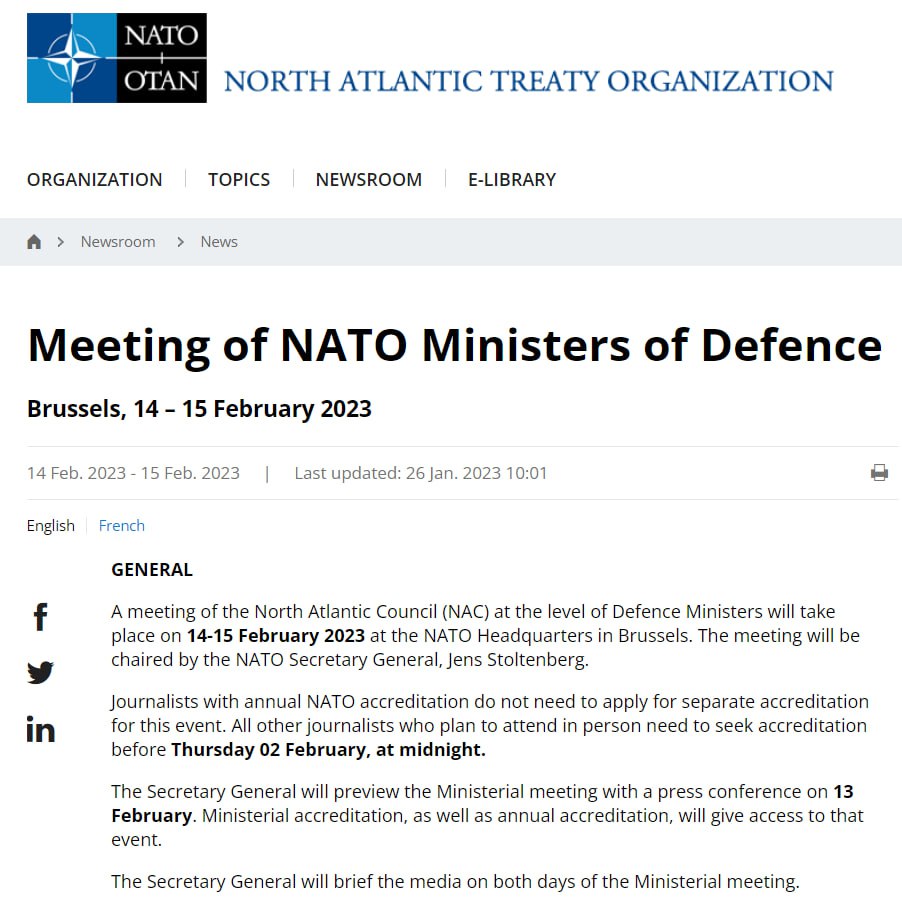 14-15 лютого відбудеться засідання Північноатлантичної ради на рівні міністрів оборони країн НАТО у штаб-квартирі НАТО у Брюсселі.