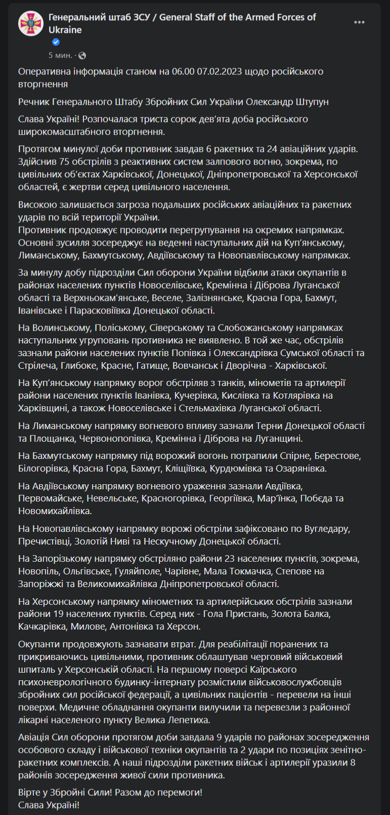 1. Противник проводить перегрупування і продовжує наступати на п'яти напрямках: Куп'янському, Лиманському, Бахмутському, Авдіївському та Новопавлівському (район Вугледару).