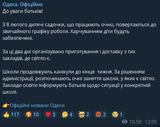 "З 8 лютого дитячі садки, які працюють очно, повертаються до звичайного графіку роботи. Харчуванням діти будуть забезпечені. За ці два дні організовано приготування та доставку з тих закладів, де є світло", - йдеться у повідомленні.