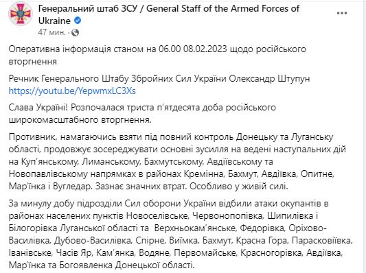 В середу, 8 лютого, Генштаб ЗСУ оприлюднив зведення про ситуацію на фронті.
