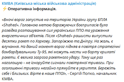 Київська міська військова адміністрація в оперативному зведенні повідомляє, що наразі ворог підняв у повітря стратегічні бомбардувальники Ту-95, які можуть нести на борту крилаті ракети. Є велика загроза ракетного удару.