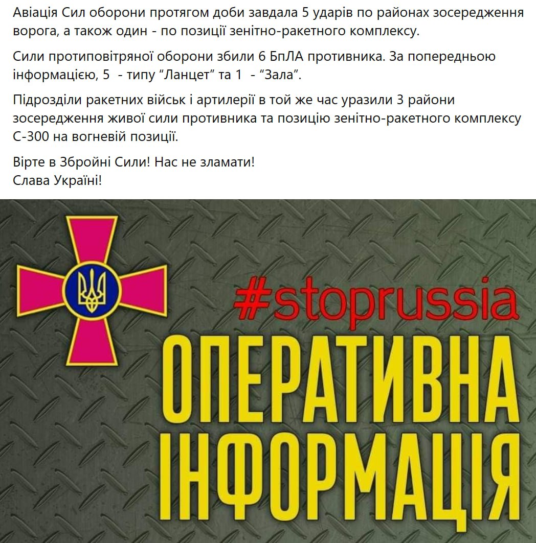 - Протягом доби противник завдав 10 ракетних та 29 авіаційних ударів (Україна завдала п'яти авіаударів). Загроза подальших ракетних ударів залишається дуже високою на всій території України.