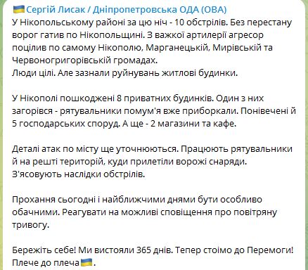 07.40 Вночі у Нікопольському районі Дніпропетровської області було 10 обстрілів РФ.