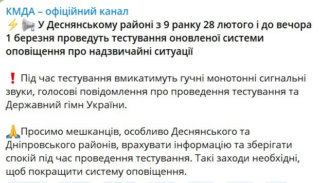 КМДА повідомляє про тестування нової системи оповіщення про надзвичайні ситуації. Згідно з повідомленням у телеграм-каналі мерії, у Деснянському районі з 9 ранку 28 лютого та до вечора 1 березня проведуть тестування оновленої системи оповіщення про надзвичайні ситуації.