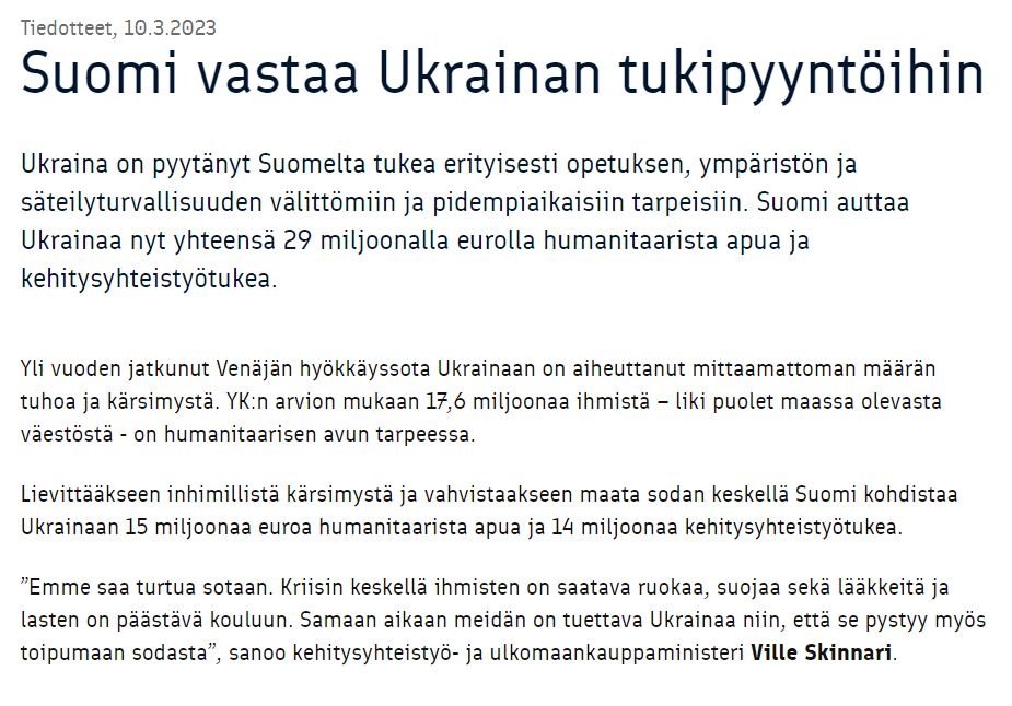 "Щоб полегшити людські страждання та зміцнити країну у розпал війни, Фінляндія виділяє Україні 15 мільйонів євро на гуманітарну допомогу та 14 мільйонів євро на підтримку співпраці з метою розвитку", - йдеться у повідомленні.