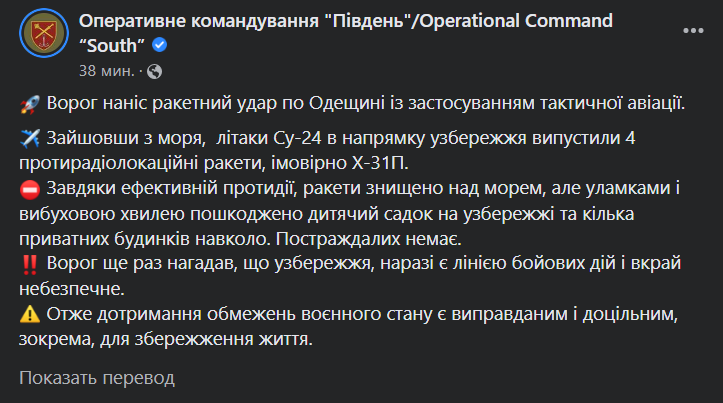 Під час ранкової повітряної тривоги Росія завдала ракетного удару по Одеській області із застосуванням тактичної авіації.