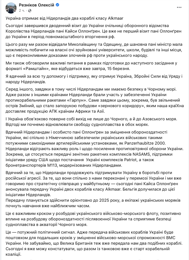 Також Резніков повідомляє за підсумками візиту Оллонгрен, що Україна до 2025 року отримає від Нідерландів два кораблі класу Алкмар, під які екіпажі українських моряків незабаром розпочнуть навчання.