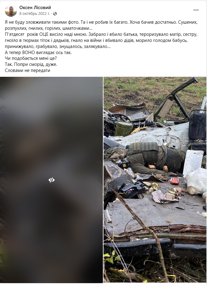 "П'ятдесят років ЦЕ висіло з мене. Забрало і убило батька, тероризувало матір, сестру, гноило у в'язницях тіток і дядьків, гнало на війни і вбивало дідів, морило голодом бабусь, принижувало, грабувало, знущалося, залякувало... А тепер воно виглядає так. Чи подобається мені це? Так. Незважаючи на сморід, дуже. Словами не передати", - писав Лісовий.
