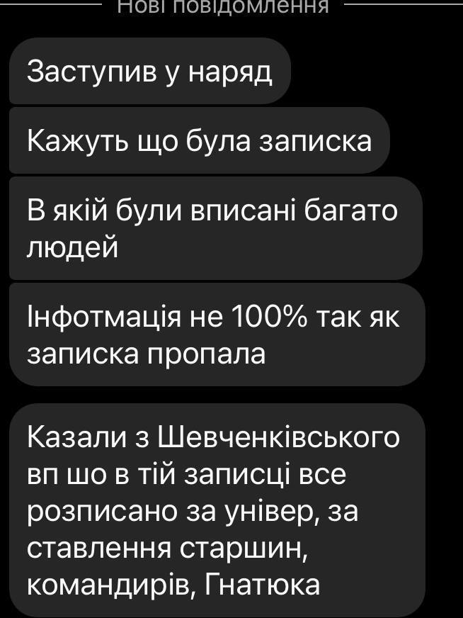 "Причиною цього випадку курсанти вказують на погрози декана факультету у бік курсанта. Гнатюк (прізвище декана - Ред.) погрожував, що до кінця випуску (понад півтора року) курсант перебуватиме на казармі і без звільнень. Слід зазначити, що саме в це вбрання напередодні парубка поставив саме Гнатюк", - пишуть у спільноті.