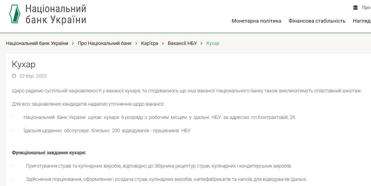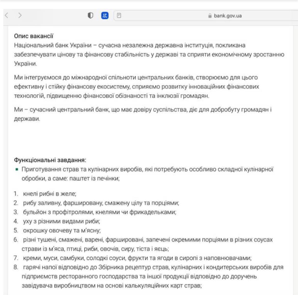 В НБУ опублікували вакансію кухаря, в якій було зазначено перелік страв, приготування яких було вимогою для претендента на місце до їдальні Нацбанку. Згодом опис вакансії змінили, прибравши звідти ці подробиці.