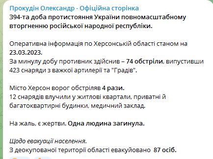 08.05 Минулої доби в Херсонській області війська РФ здійснили - 74 обстріли, випустивши 423 снаряди з важкої артилерії та "Градів".