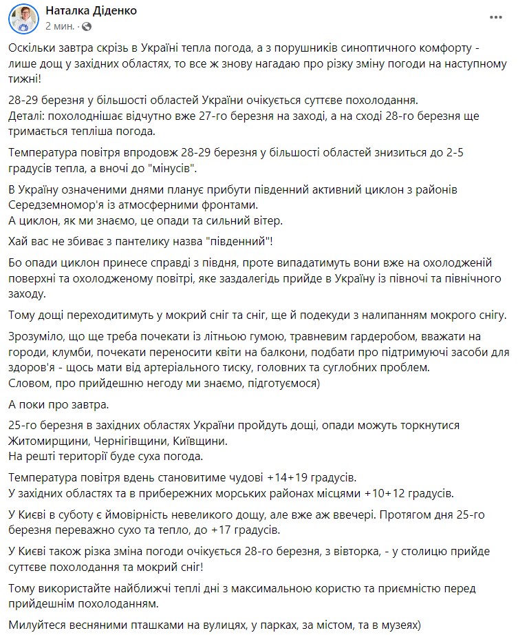 За даними Діденка, відчутно похолодає вже 27 березня, зокрема у західних областях, у східних регіонах 28 березня ще втримається тепліша погода.