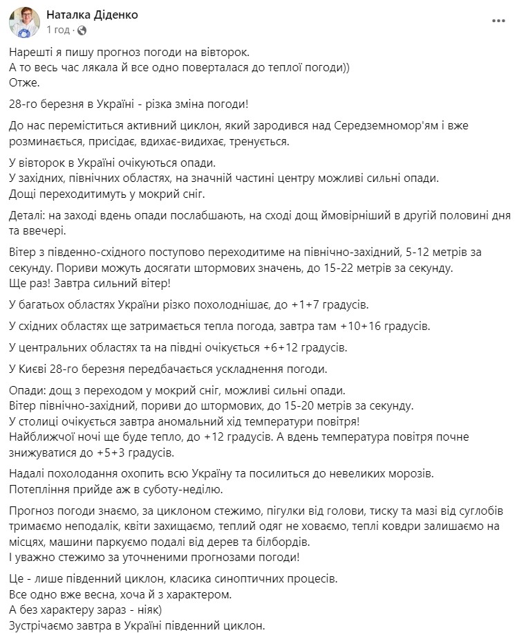 "До нас переміститься активний циклон, який зародився над Середземномор'ям", – пише вона.