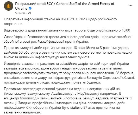 У середу, 29 березня, в Україні триває вже 399-й день війни з РФ.