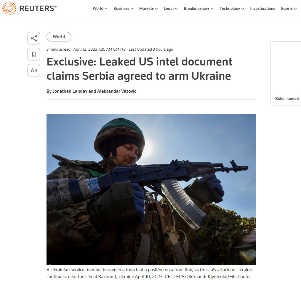 11.33 Злиті документи Пентагону вказують на згоду Сербії постачати зброю Україні, пише Reuters. Сербія офіційно це спростовує.