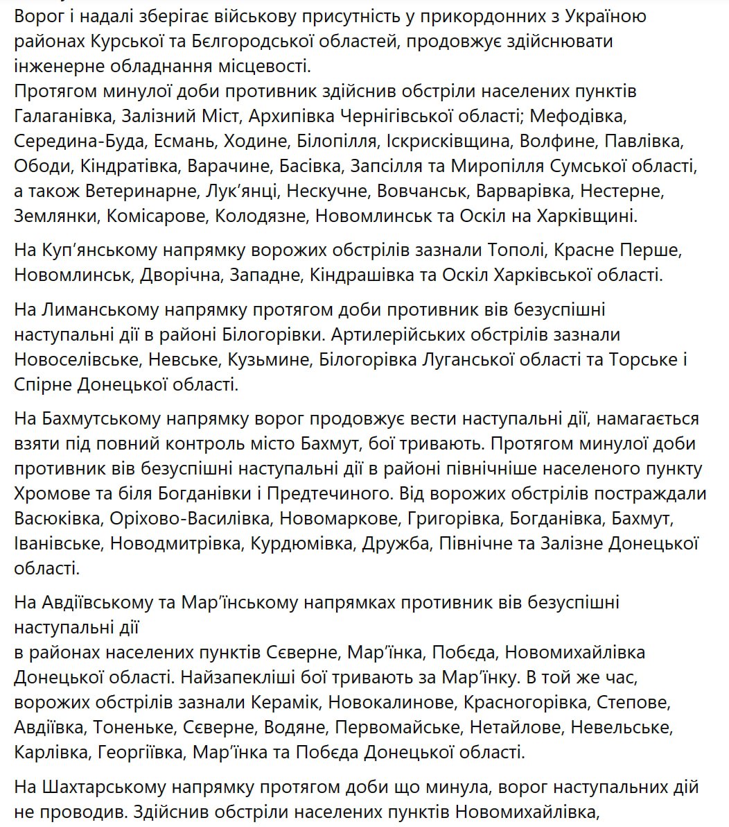 3. На Волинському, Поліському, Сіверському, Слобідському, Куп'янському, Шахтарському, Запорізькому та Херсонському напрямах ситуація без істотних змін.