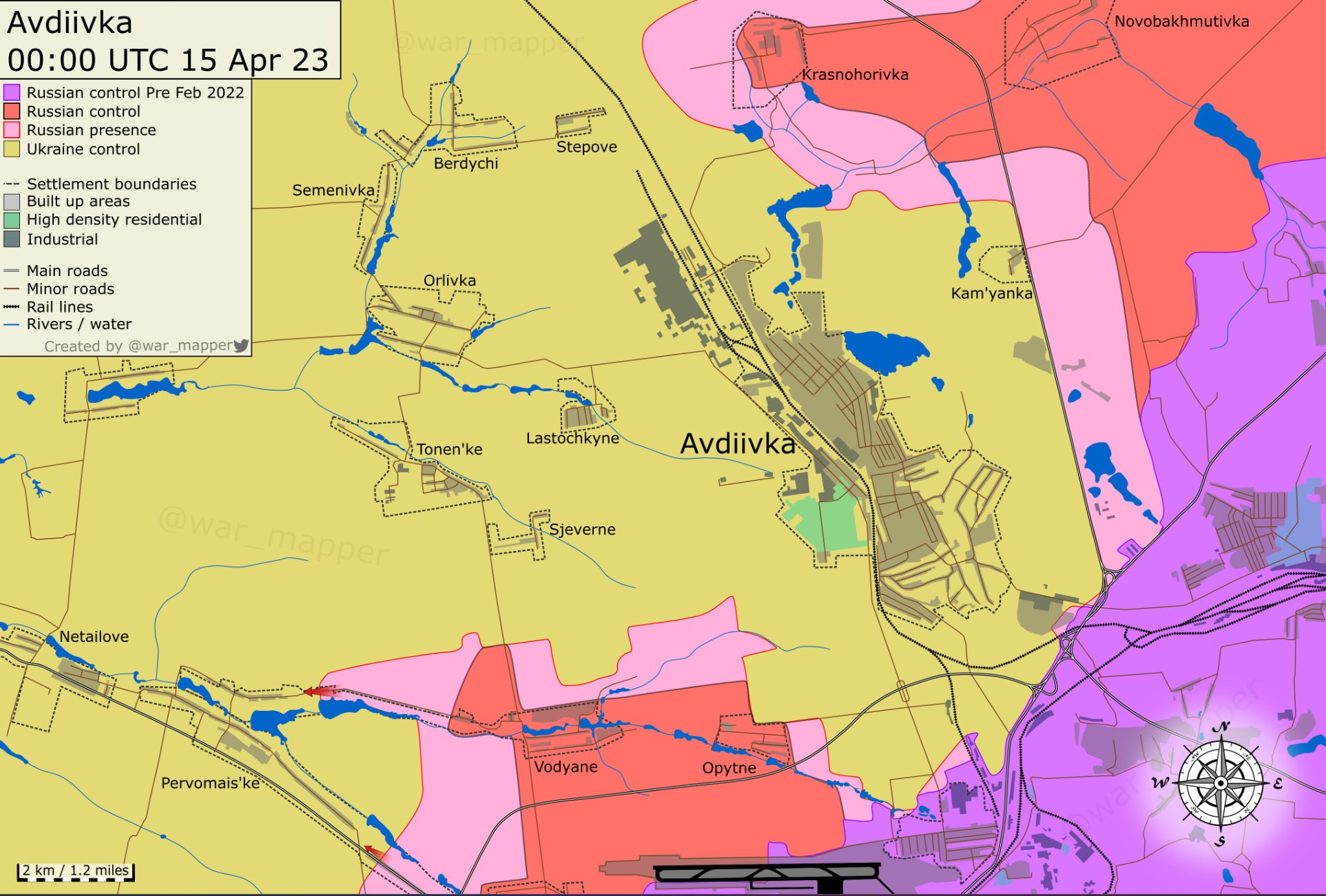 На Авдіївському напрямку, згідно з українськими зведеннями, противник наступав у Новокалинівському та Первомайському районах. "Інститут вивчення війни" пише, що російські війська, судячи з кадрів з фронту, просунулися до східної околиці Невельського (на південний захід від Авдіївки).