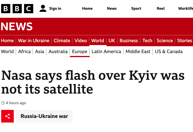 Причиною яскравого спалаху в небі під Києвом не може бути супутник NASA, оскільки на момент спалаху (близько 22:00 за Києвом) він все ще знаходився на орбіті і в атмосферу Землі не входив.