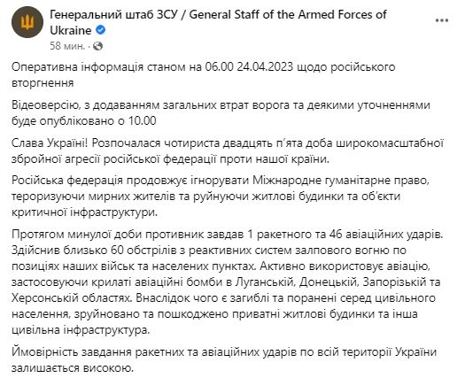 У понеділок, 24 квітня, Генштаб ЗСУ оприлюднив зведення про ситуацію на фронті