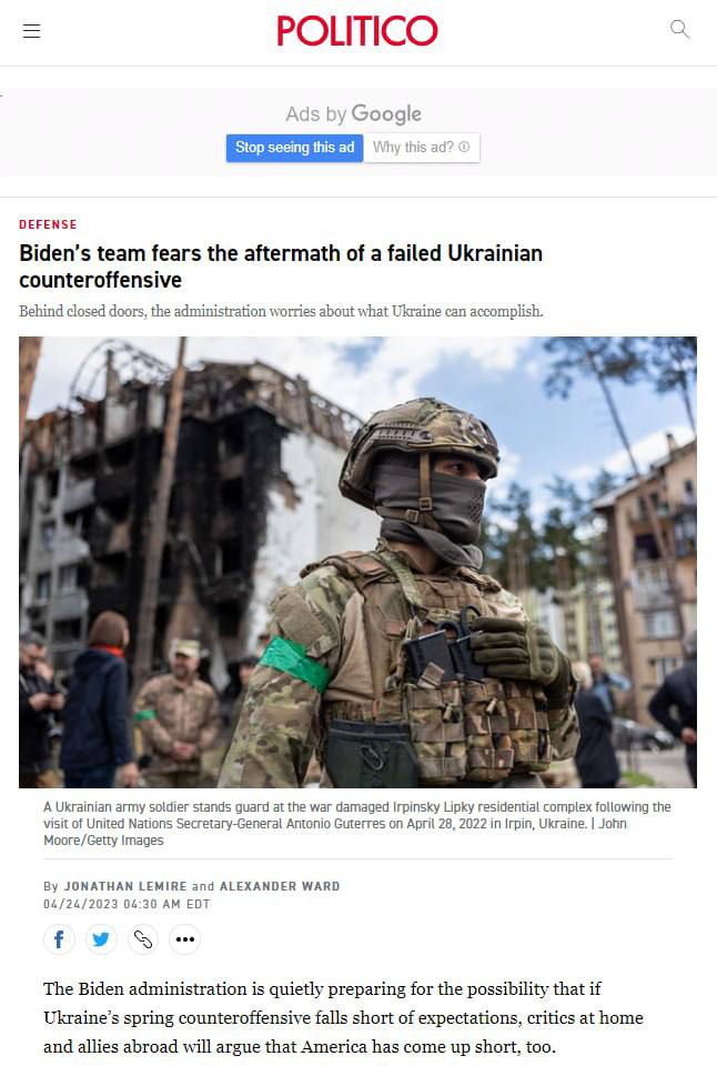 Politico також зазначає, що команда Байдена боїться наслідків у разі невдалого контрнаступу ЗСУ.