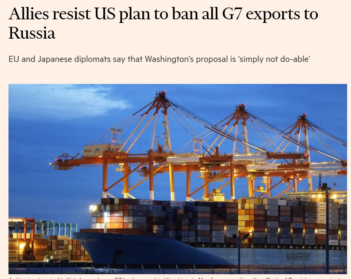 Союзники опираються плану США заборонити весь експорт G7 до Росії. Дипломати Євросоюзу та Японії кажуть, що пропозиція Вашингтона "просто нездійсненна".