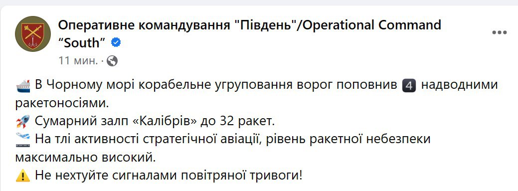 "У Чорному морі корабельне угруповання ворог поповнив надводними ракетоносіями. Сумарний залп "Калібрів" до 32 ракет", - заявили у командуванні та закликали не ігнорувати тривогу.