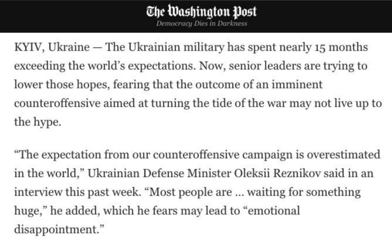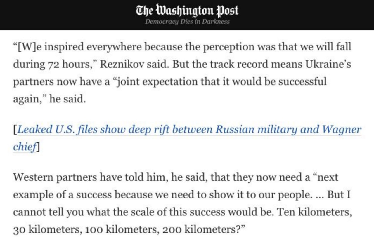 "Більшість людей чекають на щось грандіозне, що може призвести до емоційного розчарування. Західні партнери сказали мені, що тепер їм потрібен наступний приклад успіху, тому що ми повинні показати його нашим народам... Але я не можу вам сказати, які будуть масштаби цього успіху" "Десять кілометрів, 30 кілометрів, 100 кілометрів, 200 кілометрів? В ідеалі наступ має перерізати тилові ланцюги російських військ і знизити їх наступальні можливості", - сказав міністр.