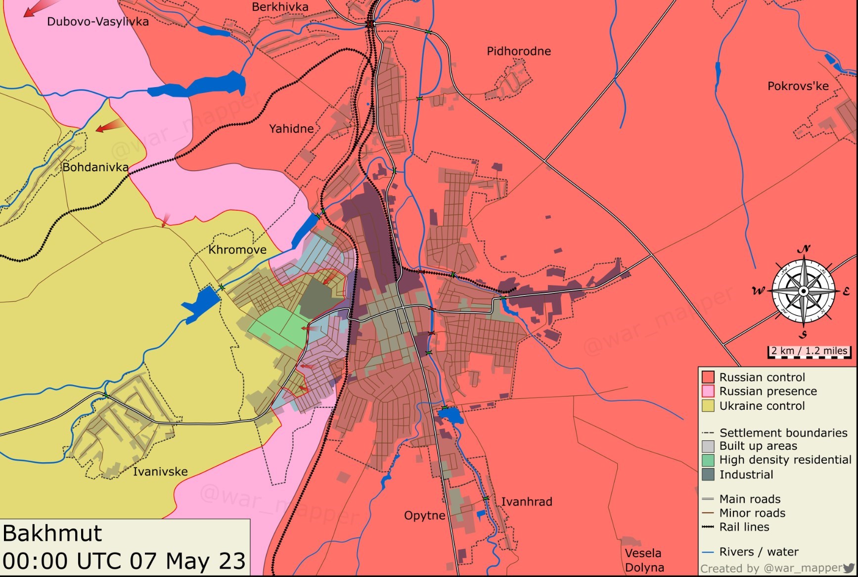 "Інститут вивчення війни" без подробиць повідомляє, що російські війська просунулися у західній частині Бахмута. Про те, що поступи незначні, традиційно говорять і у "Вагнера".