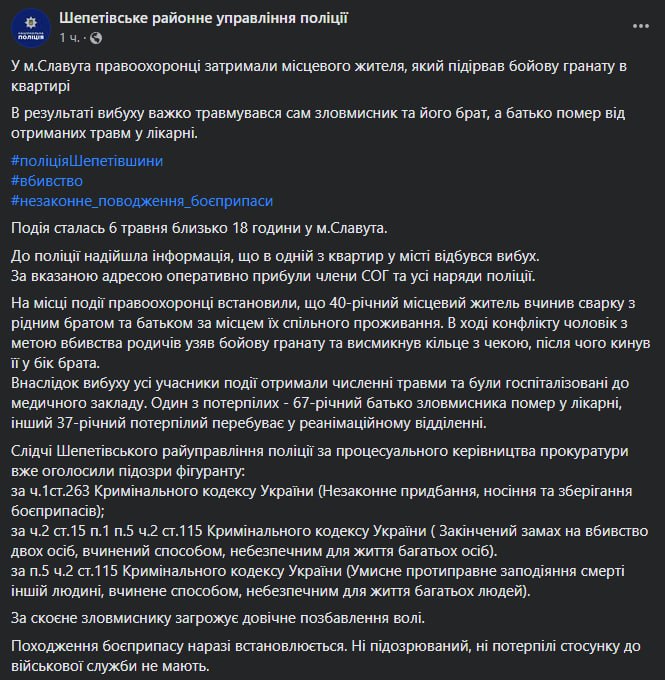 У Славуті Хмельницької області чоловік підірвав гранату у квартирі та вбив свого батька. 37-річний брат підривника, що знаходився там же, знаходиться в реанімації.