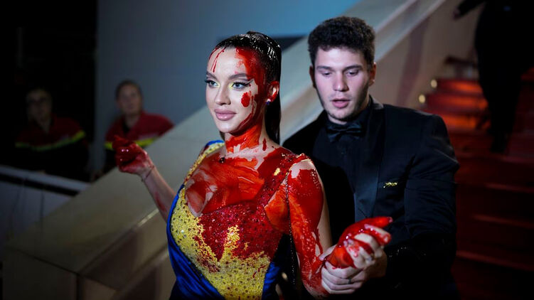 Блогер та фітнес-тренер з України Ілона Чорнобай влаштувала перформанс на червоній доріжці Канського кінофестивалю, з'явившись у сукні квітів українського прапора та обливши себе бутафорською кров'ю.