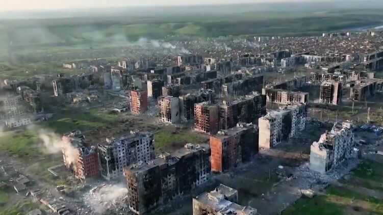 "Бахмут більше немає": New York Times публікує відео руїн міста, зняте з безпілотника. Там зображені спалені будівлі, зруйновані школи та вкриті воронками парки.