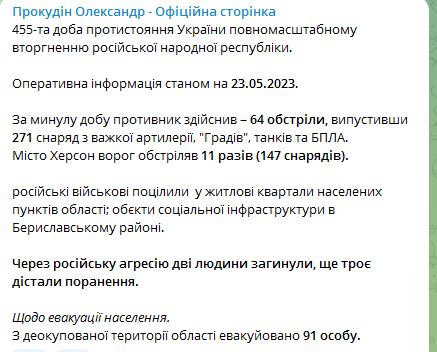 07.30 Минулої доби росіяни 64 рази обстріляли Херсон і область, випустивши 271 снаряд з важкої артилерії, "Градів", танків і БПЛА.