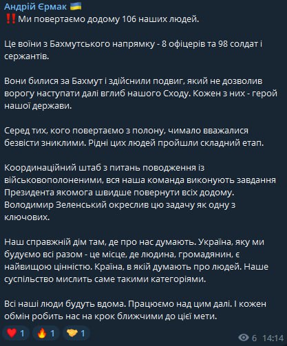 14.15 Глава Офісу президента Андрій Єрмак повідомив про повернення додому 106 полонених.