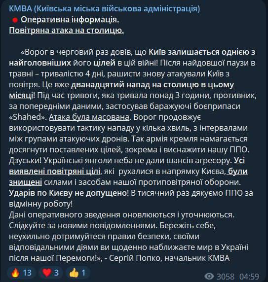 05.22 У Київській міській військовій адміністрації заявили про нічну масовану атаку «Шахідів» та про те, що всі цілі знищені.