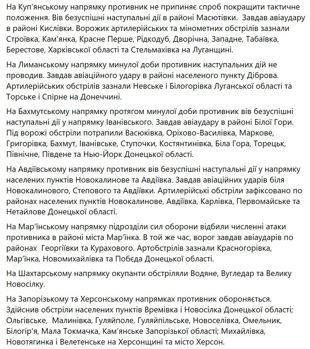 2. На Волинському, Поліському, Сіверському, Слобідському, Шахтарському, Запорізькому та Херсонському напрямах ситуація без істотних змін.