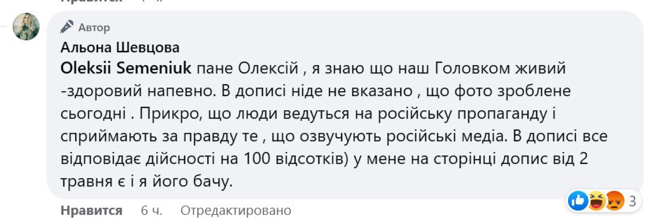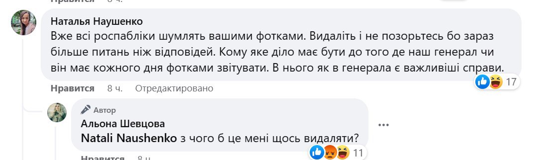 У коментарях волонтери закидали, що вона видає старі фото за нові. Шевцова відповіла: "У записі ніде не сказано, що фото зроблено сьогодні". Також вона привела посилання на свою посаду від 2 травня, яку раніше, як заявляли багато хто в коментарях, вона приховала зі стрічки.
