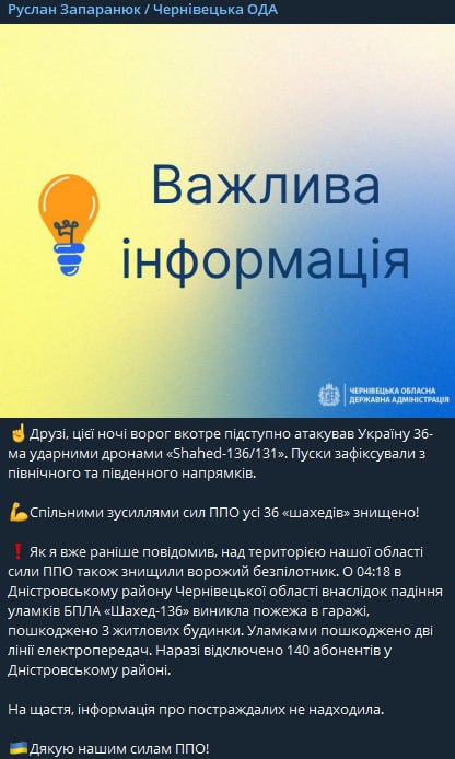Нагадаємо, цієї ночі в Україні була масштабна атака дронами. Всього було випущено та збито 36 дронів.
