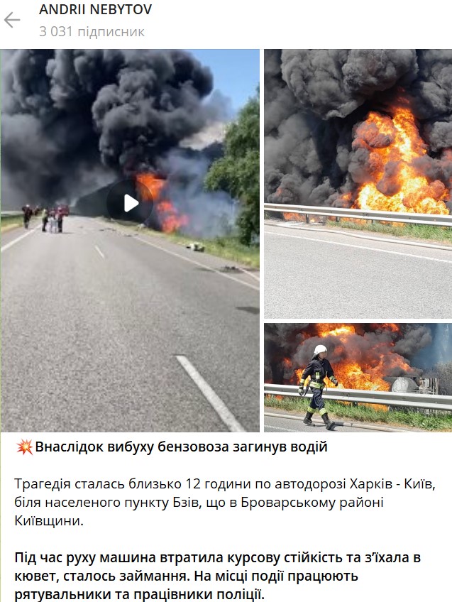 З'явилися подробиці аварії із бензовозом у Броварському районі Київської області. Через вибух загинув водій.