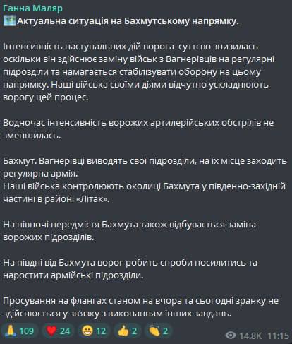 "Бахмут. "Вагнерівці" виводять свої підрозділи, на їхнє місце заходить регулярна армія. На півночі передмістя Бахмута також відбувається заміна ворожих підрозділів. На південь від Бахмута ворог робить спроби посилитися та наростити армійські підрозділи", - написала вона.