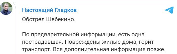 "Обстріл Шебекіно. За попередньою інформацією, є одна постраждала. Пошкоджено житлові будинки, горить транспорт. Вся додаткова інформація пізніше" - написав він уночі.
