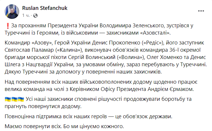 Речник Верховної Ради Руслан Стефанчук побував у Туреччині у командирів з "Азовсталі", яких Росія звільнила у вересні.