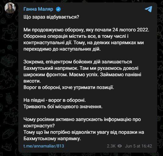 "Зокрема епіцентром бойових дій залишається Бахмутський напрямок. Там ми рухаємося досить широким фронтом. Є успіх. Займаємо панівні висоти. Ворог в обороні хоче утримати позиції", - сказано в пості заступника міністра.