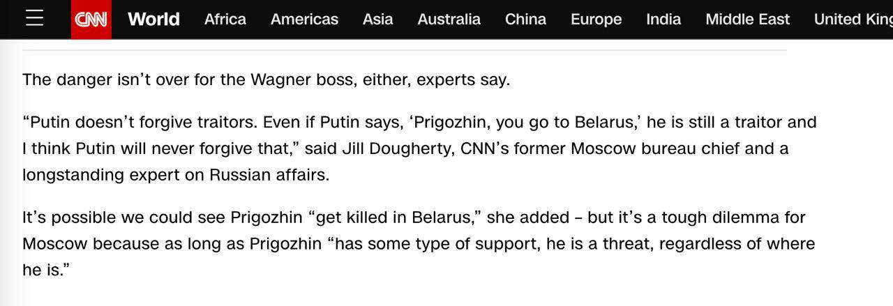 "Путін не прощає зрадників. Навіть якщо Путін скаже: "Пригожин, йди до Білорусі", він все одно зрадник, і я думаю, що Путін цього ніколи не пробачить", - сказала експерт CNN.