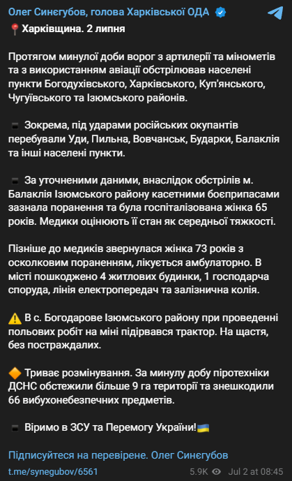 "Минулої доби ворог з артилерії та мінометів та з використанням авіації обстрілював населені пункти Богодухівського, Харківського, Куп'янського, Чугуївського та Ізюмського районів. Зокрема, під ударами російських окупантів знаходилися Уди, Пильна, Вовчанськ, Бударки, Балаклія та інші населені – пише Синегубов.