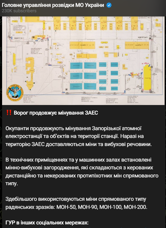 Росіяни продовжують мінування Запорізької атомної електростанції та об'єктів території станції. На територію ЗАЕС доставляються міни та вибухові речовини.