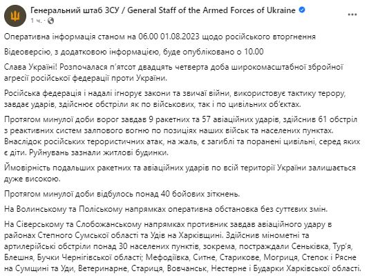 Генштаб ЗСУ вранці 1 серпня оприлюднив зведення про ситуацію на фронті.