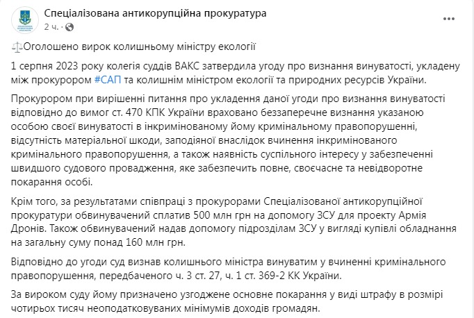Сьогодні колегія суддів ВАКС затвердила угоду про визнання винності, укладену між прокурором САП та колишнім міністром екології та природних ресурсів України Миколою Злочевським. Суд призначив покарання у вигляді штрафу у розмірі 68 тисяч гривень за зловживання впливом.