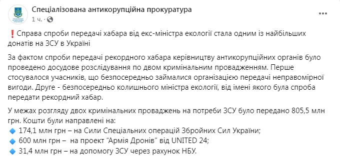 Справа спроби передачі хабара екс-міністром екології стала одним із найбільших донатів на ЗСУ в Україні. У рамках розгляду двох кримінальних проваджень на потреби ЗСУ було передано 805,5 млн. грн. Кошти були спрямовані на: