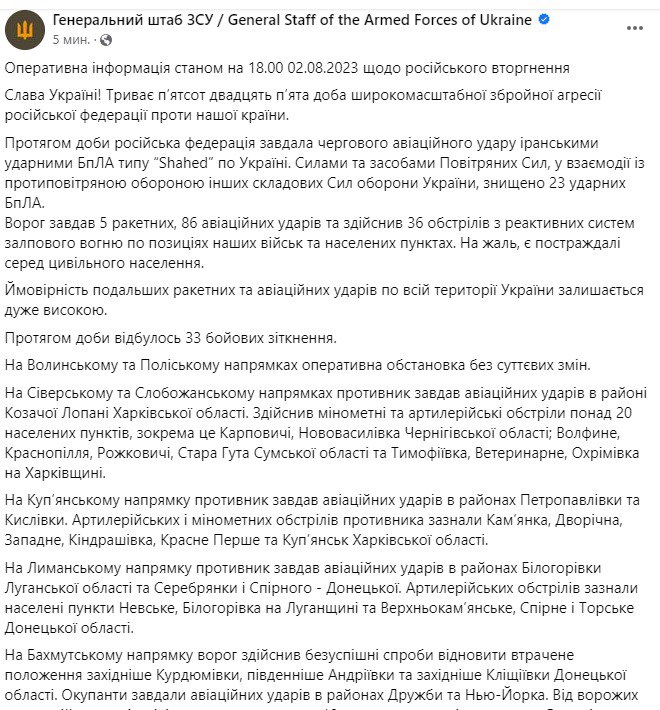 У середу, 2 серпня, Генштаб Збройних сил України опублікував вечірнє зведення.