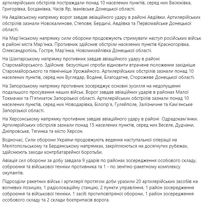- На Волинському, Поліському, Сіверському, Слобідському, Куп'янському, Лиманському, Авдіївському, Запорізькому та Херсонському напрямках ситуація без істотних змін.